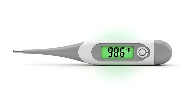 Digital thermometer displays temperature on soft blue blanket in nursery