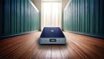 A digital scale sits on a wooden floor between green storage lockers, sunlight in view