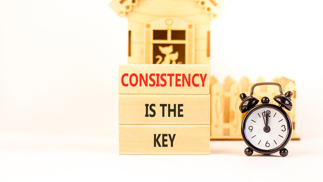Consistency is the key symbol. Concept words Consistency is the key on beautiful wooden blocks. Beautiful white background. Black alarm clock. Business consistency is the key concept. Copy space.