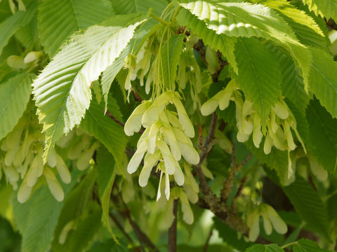 Érable à feuilles de Charme (Acer carpinifolium), arbuste ornemental aux fruits printaniers ou samares ailés pendant sous des feuilles gaufrées, nervurées et dentelées vert foncé