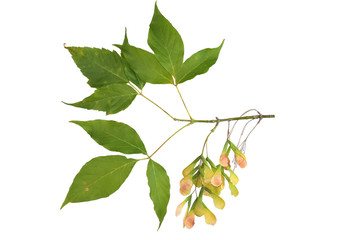 seeds of ashleaf maple, Acer negundo,maple ash twig with green leaves and blurred forest on background