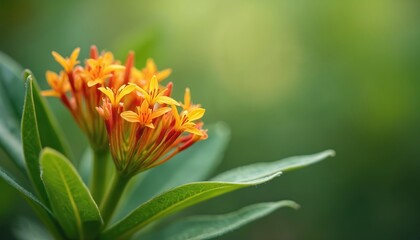 Orange tropical milkweed flowers in bloom. Blossoms with yellow and red petals. Green leaves and stems. A close up nature photo with a soft blurred background.