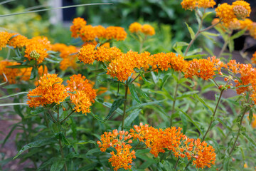 Orange asclepias tuberosa or butterfly weed flowers blooming