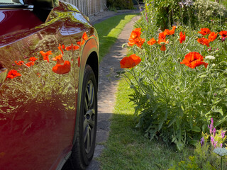 Hampshire England UK.  A red car on the driveway of a country garden with poppies reflected in the red bodywork.