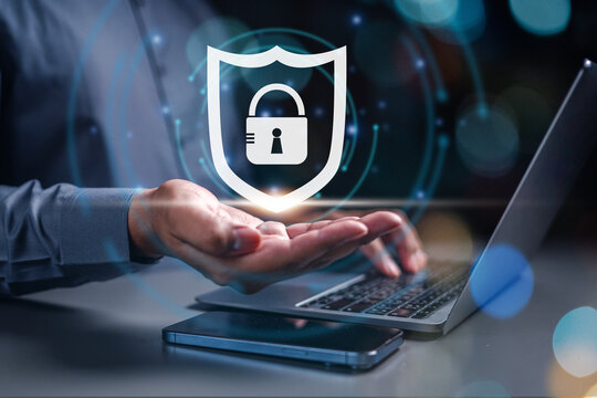 technology, business, firewall, security, guard, privacy, protection, safety, verification, shield. hand of businessman has guard safety protection is showing. other hand is typing keyboard for acess.