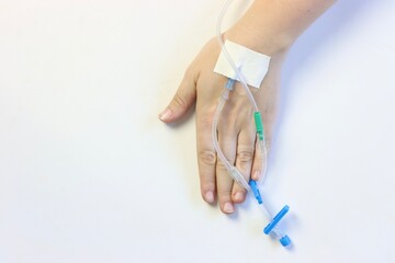 Woman hand in a white background with intravenous acess and the infusion set connected.