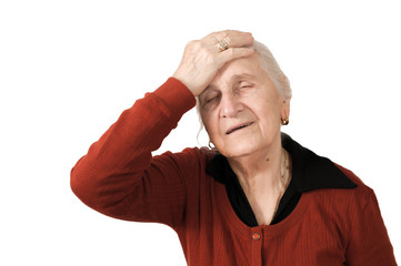 Isolated migraine head ache pained old lady on white background