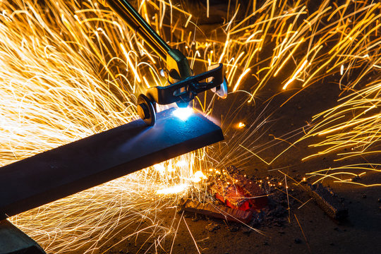 Factory worker cutting metal using acetylene torch, manual plasma cuting in a steel factory lot's of sparks all over