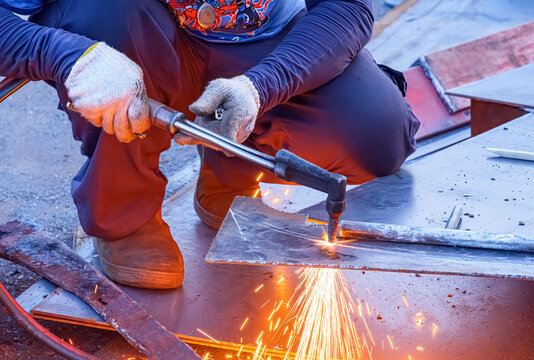 Cropped image of welder is cutting iron plate with acetylene gas welding torch machine for ship improvement work at shipyard