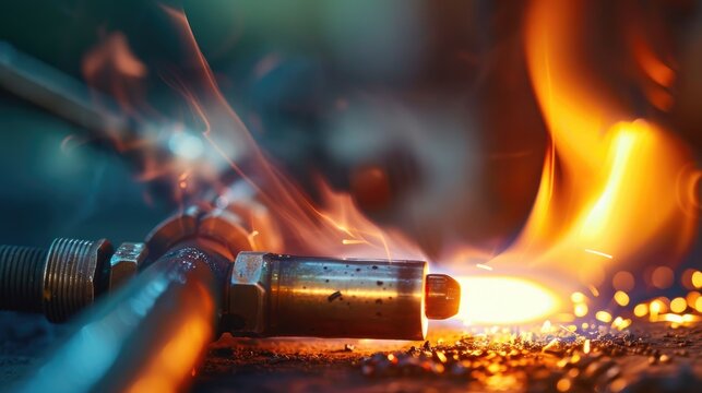 A journeyman pipe fitter in a metal fabrication plant using an Acetylene torch to cut a hole in a pipe to prepare it for a joint to another pipe; Innisfail, Alberta, Canada