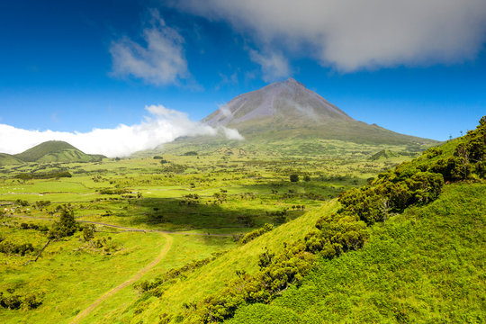 Aerial image of typical green volcanic caldera crater landscape with volcano cones of Planalto da Achada central plateau of Ilha do Pico Island, Azores