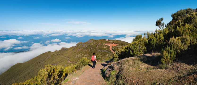 Girl walks along the trail.  Beautiful mountain landscape. Portugal, Madeira, View of the mountains and Parking PR1.2 Achada do Teixeira near Arieiro peak - the highest point of Madeira island.