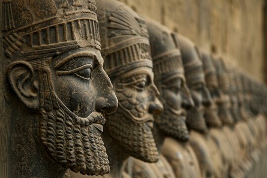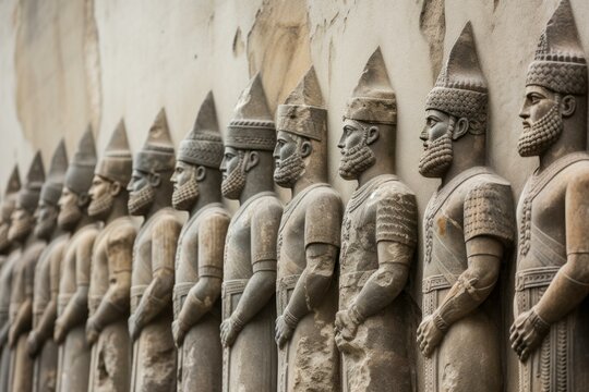 Detailed basrelief sculpture of ancient persian soldiers on a weathered stone wall. Showcasing the historic craftsmanship and cultural heritage of the achaemenid empire in iran