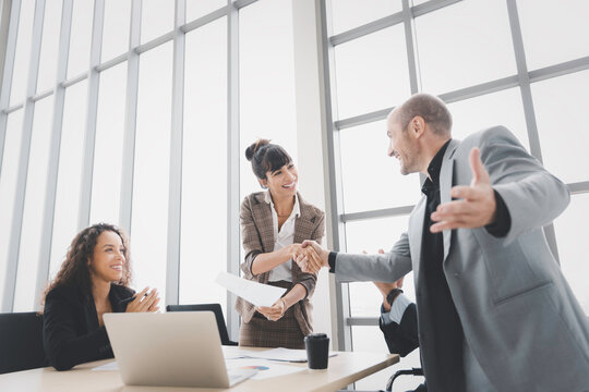 Smiling businesswoman handshake celebrate success or acheivement with team