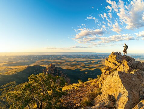 hiker in the mountains, man standing on top of a mountain while enjoying sunset on the mountain