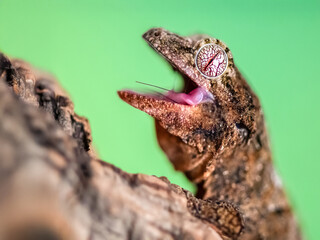 Portrait of a young Short-Snouted Giant Gecko "mainland form" eating a House cricket on a branch in a terrarium. Mniarogekko chahoua, Acheta domesticus, Loiret 45, région Centre Val de Loire, France