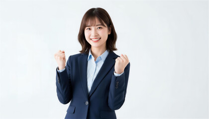 白背景で力強く両手でガッツポーズするビジネス女性