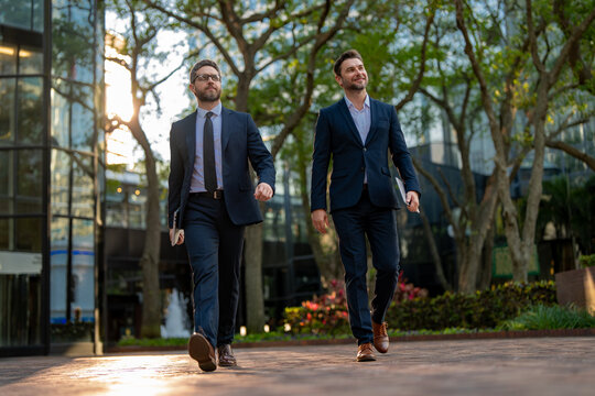 Business man in Ney York. Business men walking across city street, outdoor. Business teams leadership. Ambition of two businessmen to achieve greatness. Business team led to their success.
