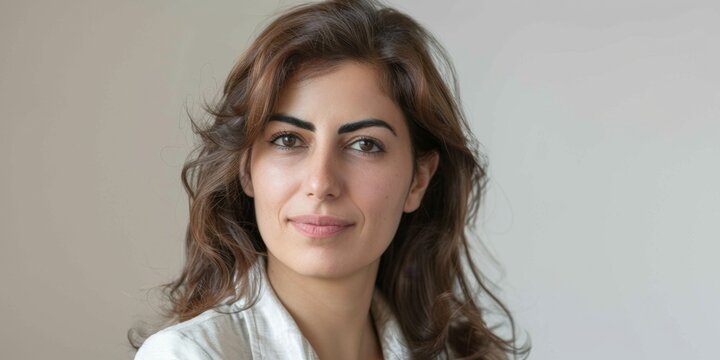 Abstract Portrait of a Successful Middle Eastern Woman in Her 30s with Brown Hair on a Cream Background, Depicting Corporate Success and Professionalism for Themed Articles, Marketing Campaigns, and A