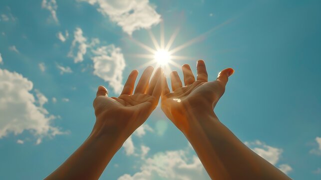 A pair of hands reaches towards the bright sun against a backdrop of blue sky and fluffy clouds, symbolizing hope and aspirations.