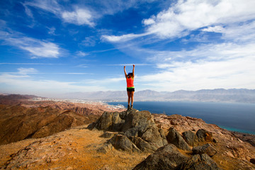 Female hiker celebrating achievement on reaching summit of the Eilat mountains, Israel