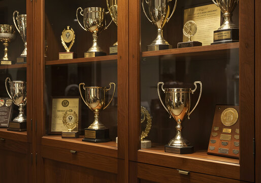 Collection Of Silver And Gold Trophies In A Dark Wooden Display Case