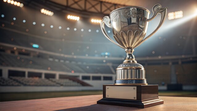 Shiny trophy cup on display in a sports arena, symbolizing victory and achievement