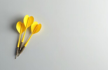 Three yellow plastic darts lie on a light grey background. Darts have metal tips and yellow feathers. Top view of darts in a cluster. Simple and minimalist composition.