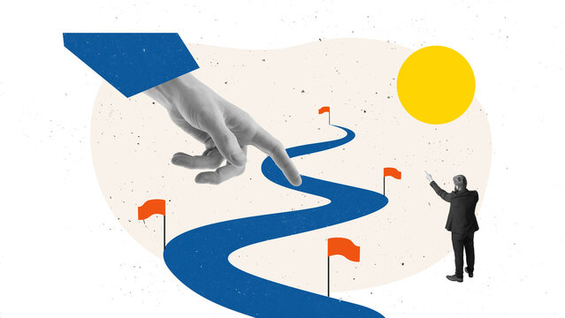 Bold composition of giant hand pointing business direction toward rising path. Concept of strategic guidance, consulting services, corporate planning, and decision facilitation.