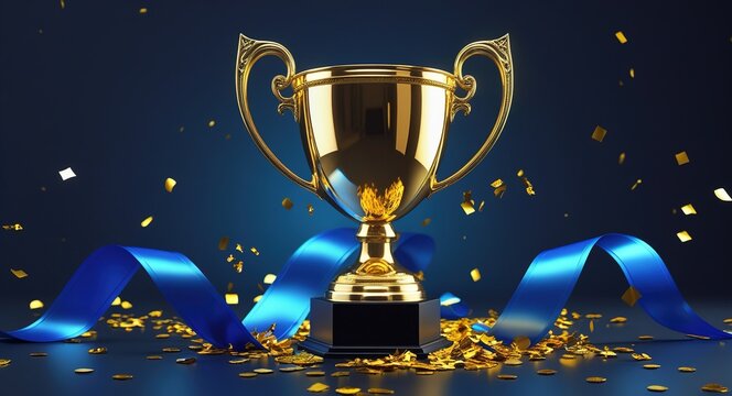 Digital artwork featuring a golden trophy with ornate handles against a dark blue gradient background. Golden confetti and a flowing blue ribbon surround the trophy, creating a celebratory and elegant