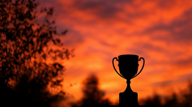 An abstract trophy silhouette against a vibrant sunset, symbolizing achievement, victory, ambition, and celebration in a modern artistic style.