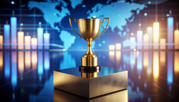 A golden trophy standing against a backdrop of statistical data and graphs, symbolizing achievement and success.