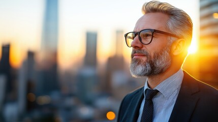 confident smiling businessman standing tall in a big city with modern skyscrapers during sunset reflecting on achievements and planning future success