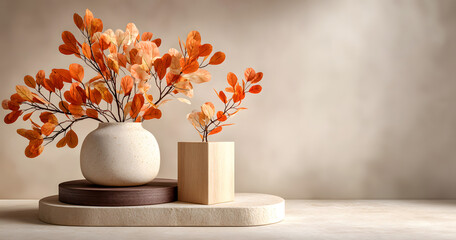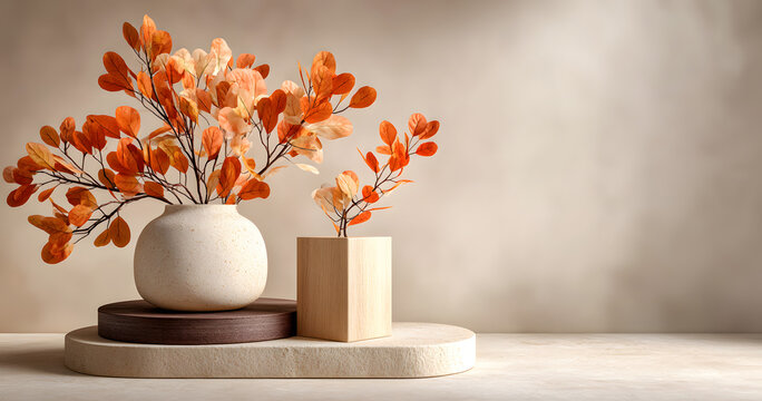 A serene autumn-themed setup featuring orange leavesin a vase, with two circulr platforms on a beige surace. The warm, minimalist ackground enhances the earhy tones of the scene