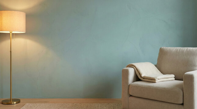modern living room interior with armchair brass floor lamp and teal textured wall