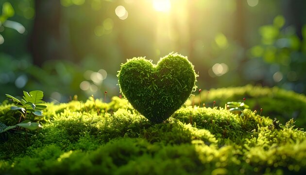 3D heart object sculpted from fresh green moss, natural daylight, jungle atmosphere, eco-friendly Valentine concept
