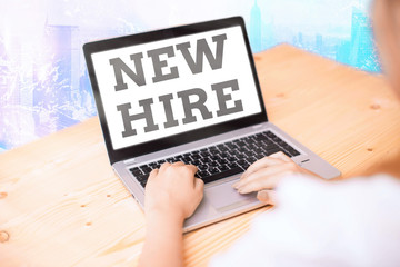 Conceptual hand writing showing New Hire. Concept meaning someone who has not previously been employed by the organization Businessman in blue suite with a tie holds lap top in hands