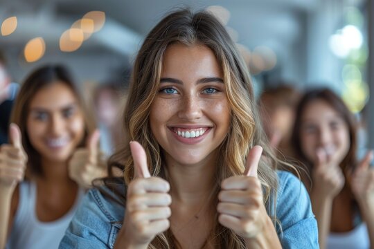 Portrait of a smiling woman giving a double thumbs up with blurred group background