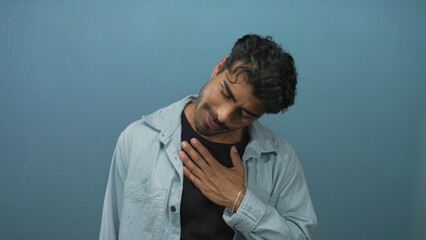 bearded man showing phone call gesture or shaka sign with hand. cropped shot of a male torso on blue background. casual hipster in grey t-shirt.