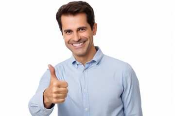 Portrait of a blissful man in his 30s showing a thumb up in front of white background
