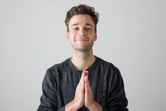 Portrait of a tender caucasian man in his 30s joining palms in a gesture of gratitude in white background