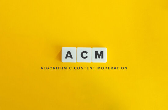 Algorithmic Content Moderation (ACM). Letter Tiles on Yellow Background. Minimal Aesthetic.