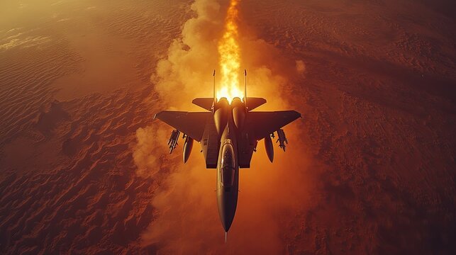 Jet aircraft performing evasive maneuvers in heated military confrontation over desert war zone