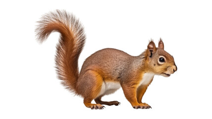 Fluffy baby squirrel holding an acorn isolated on white background