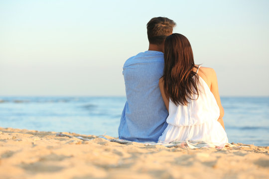 Happy young couple sitting together on beach