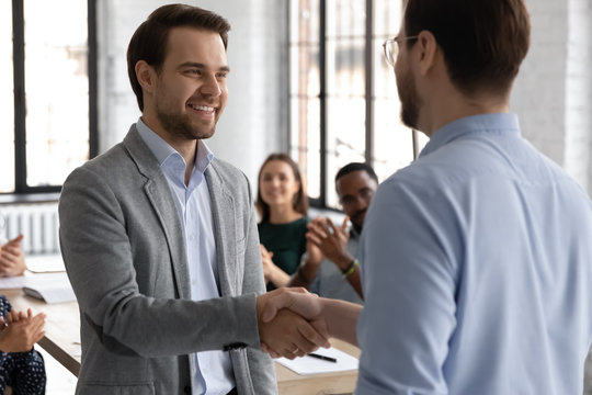 Happy diverse employees with young male leader or boss in front meet welcome new worker into team. Smiling businessman stretch hand for handshake with newcomer in office. Recruitment concept.