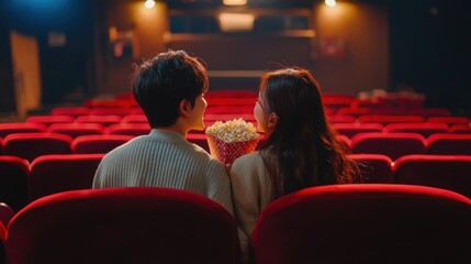 Young romantic loving couple with popcorn watching movie in cinema, relationships and lifestyle concept,bokeh pink heart in cinema,romantic spending time together,valentine day concept.