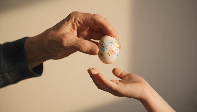 Hand passing a gift envelope with a ribbon bow and heart for Valentine's Day celebration between two people on a colorful backdrop