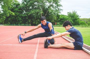Training teammates. Two male athletes is warming-up,Two runners sitting on the racetrack at the stadium stretching their legs before running