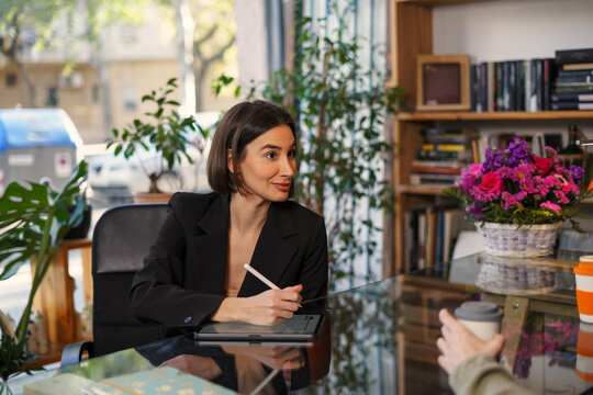 Colleagues shaking hands in modern office with ar icons showing collaboration